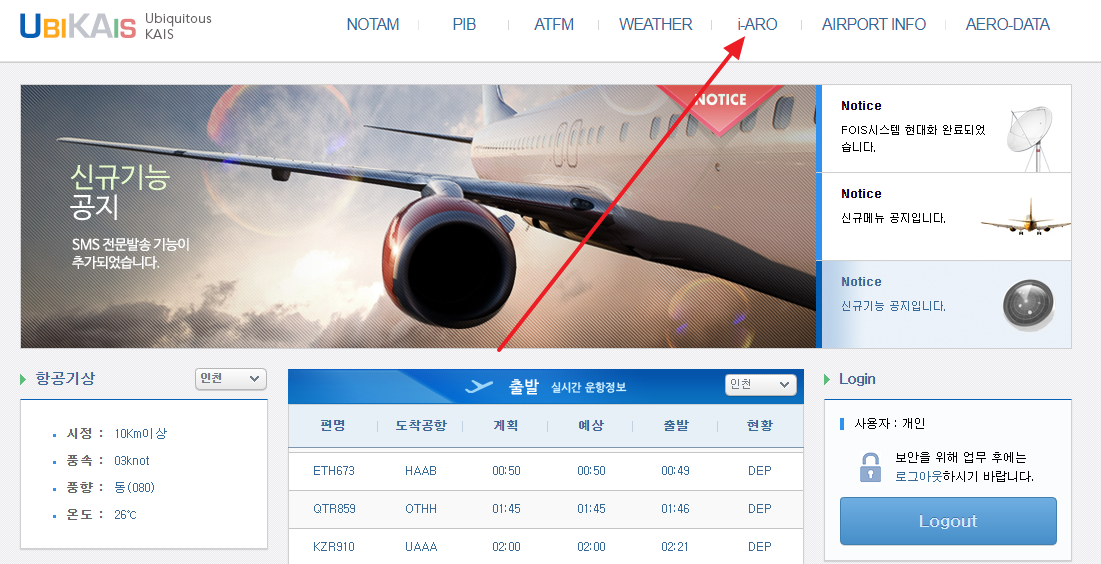 가입을 하지 않았다면 가입을 하고 위쪽 메뉴에 있는 i-ARO를 마우스로 누릅니다.